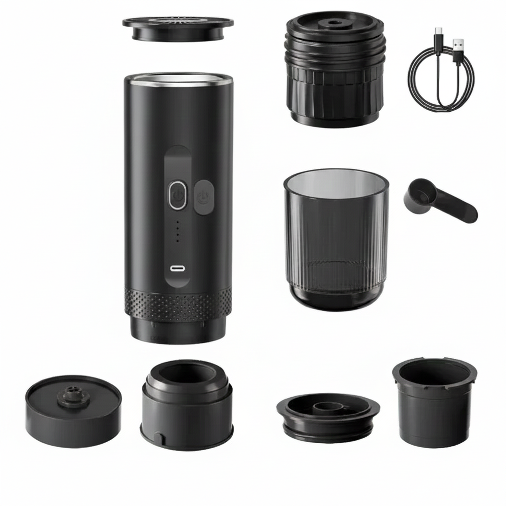 Kompaktowy design idealnie mieści się w uchwycie samochodowym, a wydajny akumulator pozwala na przygotowanie do 5 filiżanek espresso z zimnej wody na jednym ładowaniu.